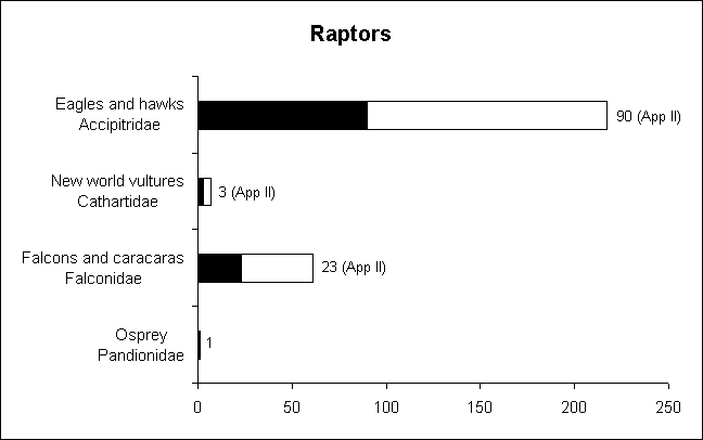 Fig. 4.10: Number of migratory raptors. Total bar: species numbers within the family, black: number of migrants. |