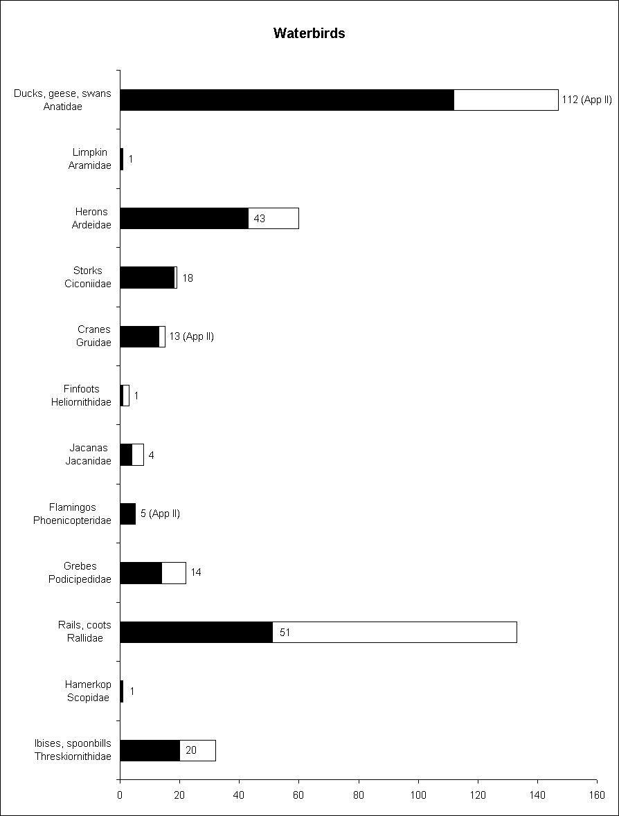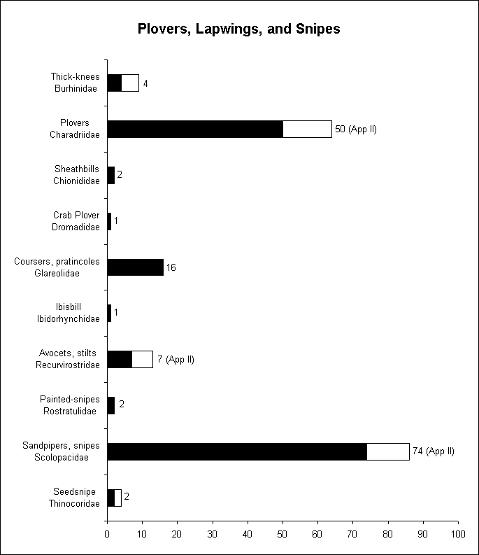 Fig. 4.7: Number of migratory plovers, sandpipers and snipes (shorebirds). Total bar: species numbers within the family, according to del Hoyo et al. (1996). The number of migrants is given and indicated by the black section. Entire families listed on Appendix II are marked. |
