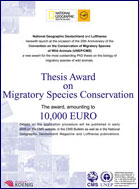 tiny news image Last call for applications for the UNEP/CMS Thesis Award! The UNEP/CMS Thesis Award on Migratory Species Conservation, sponsored by National Geographic Deutschland and Lufthansa, is now open for applications until May 2008.